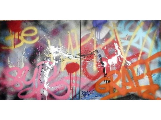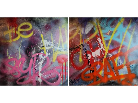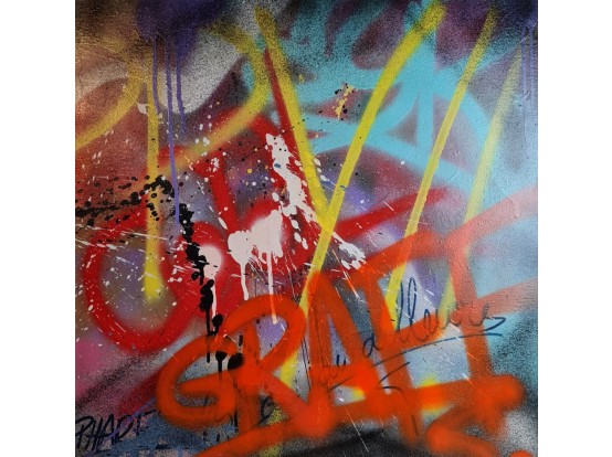 Diptych by the French street artist Fred Bellot, who works under his "Tag" SYR. Colorful work in spray paint on canvas, stretched on a wooden frame. Equipped with a handmade wooden frame. The two works each measure 50 x 50 cm. The set therefore measures just over 50 x 100 cm.