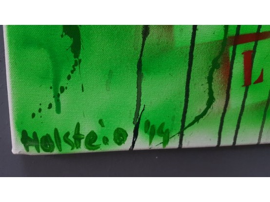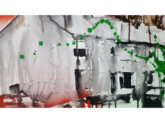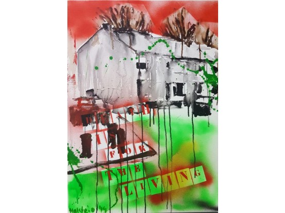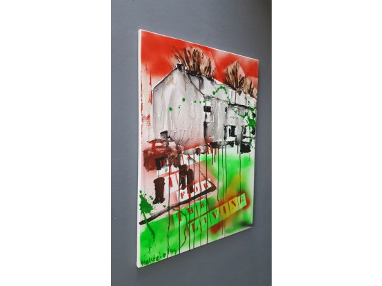 Gesigneerd werk uit 2014, gemengde techniek (acryl en spuitbus) op doek (houten frame).