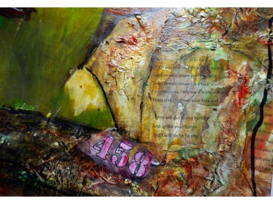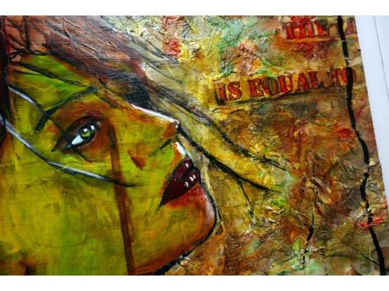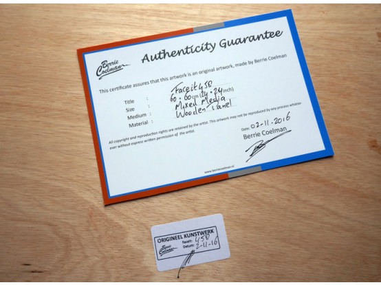 Collage op houten paneel van 60 x 60 cm. Gemengde techniek (aquarel, inkt en papier) vervolgens gevernist en gesigneerd. Het unieke werk is nummer 458 uit de serie Faceit. Kan in principe zo aan de muur maar ik adviseer het werk in een baklijst op te nemen. Vraag hiervoor een prijsopgave.