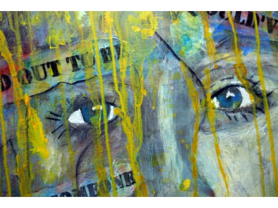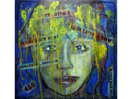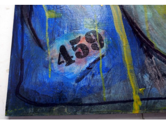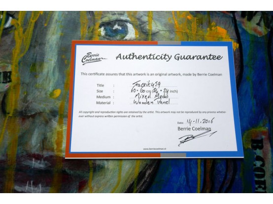 Collage op houten paneel van 60 x 60 cm. Gemengde techniek (aquarel, inkt en papier) vervolgens gevernist en gesigneerd. Het unieke werk is nummer 459 uit de serie Faceit. Kan in principe zo aan de muur maar ik adviseer het werk in een baklijst op te nemen. Vraag hiervoor een prijsopgave.