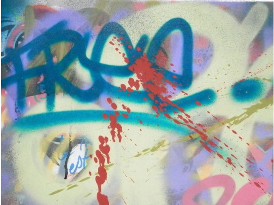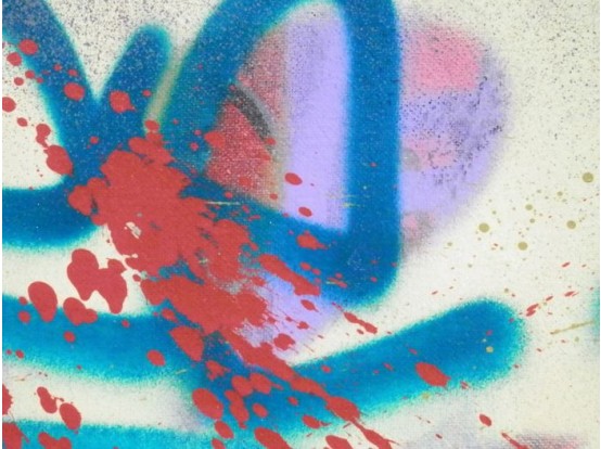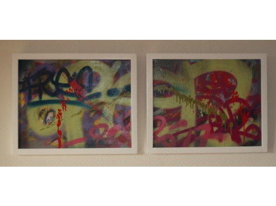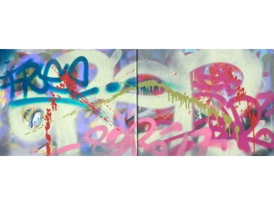 Diptiek van de Franse street artist Fred Bellot, die werkt onder zijn "Tag" SYR. Kleurig werk in spuitverf op doek, gespannen op een houten frame. Voorzien van een handgemaakte houten lijst. De twee werken hebben ieder de afmeting van 43 x 52 cm. De set meet dus 43 x 105 cm.
