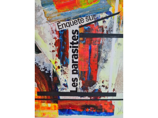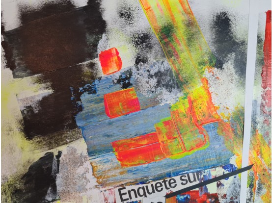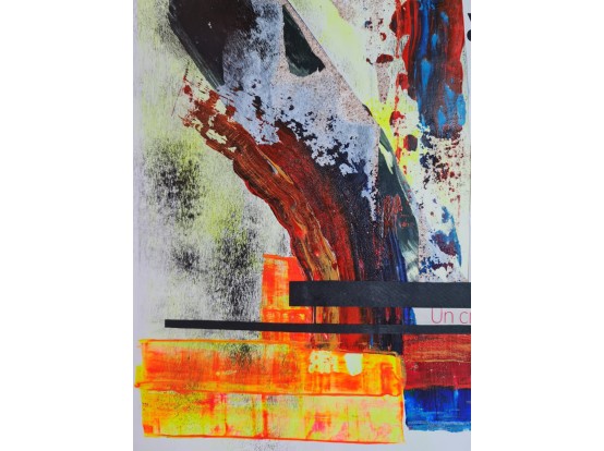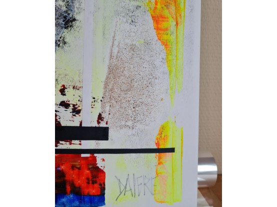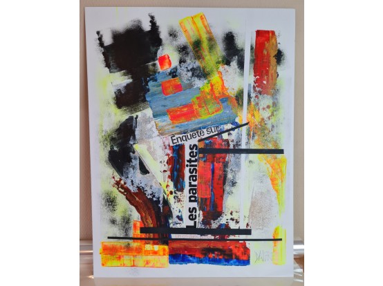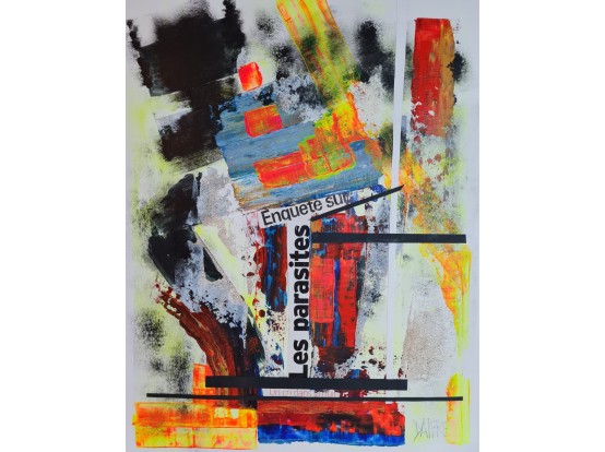 Beautiful work from a series of 6 abstract compositions by this famous French artist. The work was made in 2014 and signed at the bottom right. It is a combination of a collage with acrylic paint. Unique work measuring 48 x 69 cm.