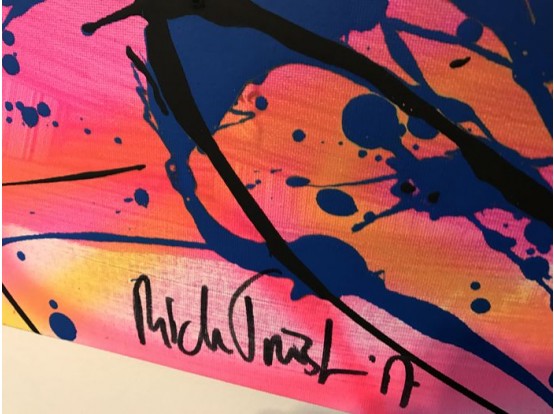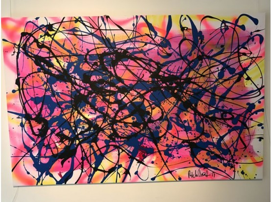 Kleurrijk schilderij uit 2017 van de Amsterdamse kunstenaar Rick Triest. Acrylverf op doek en gespannen op houten frame. Gesigneerd door de kunstenaar en rechtstreeks uit zijn atelier. Bij levering voorzien we het doek van een witte baklijst.