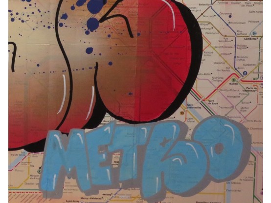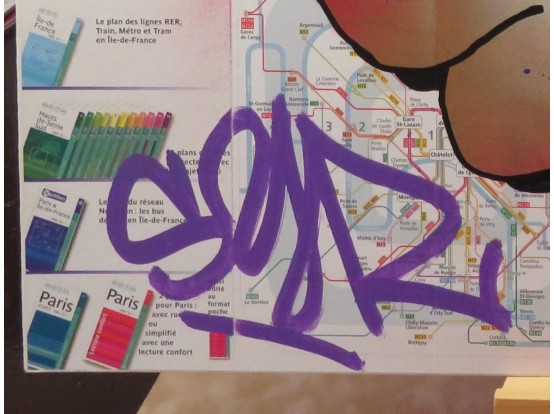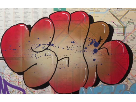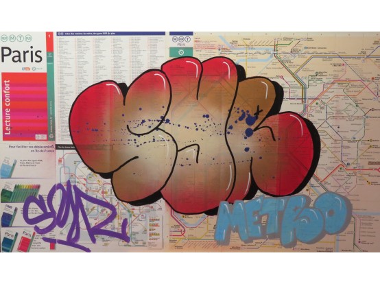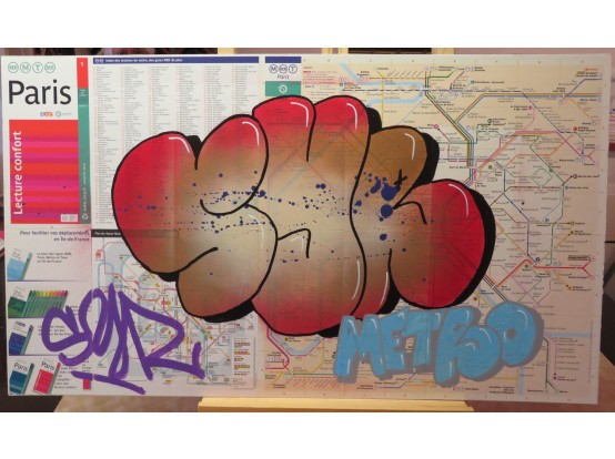 Spray paint on the map of the Metro in Paris. Very original street art by the French artist SYR. It is one of a series of unique works, all made in the same way.