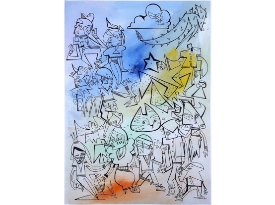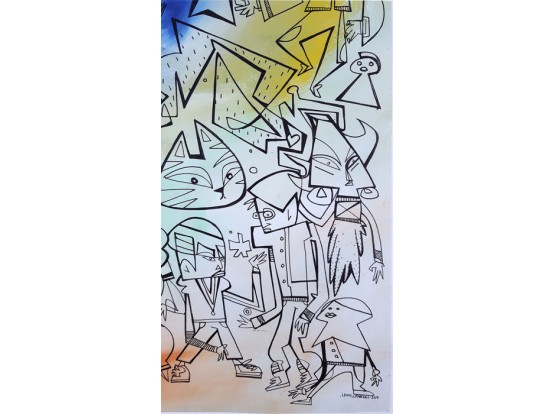 Recent work (2019) in mixed media by the Englishman Leon Sparkes. Watercolor on paper with hand-drawn characters on it.