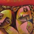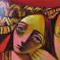 Nizar Alhattab's style is characterized by colorful depictions of female figures in the clothing of his native Syria. In real life, the colors are even more vibrant than in the photographs.