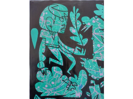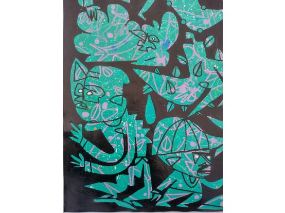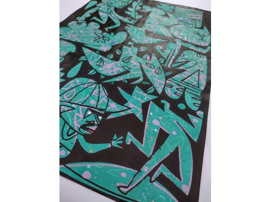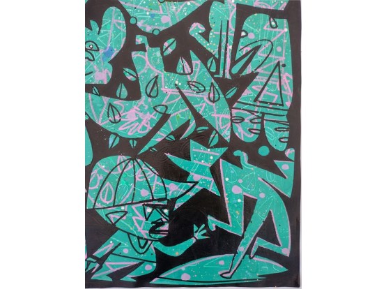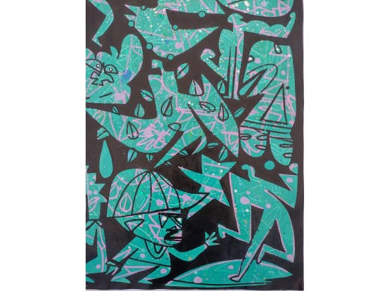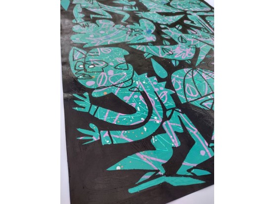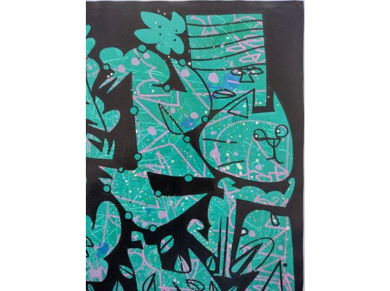 Large painting from 2021 by the English artist Leon Sparkes. An original hand-drawn illustration with quirky characters on an abstract and dotted background. This work was created using mixed media. pen, paint and spray paint on patterned paper.