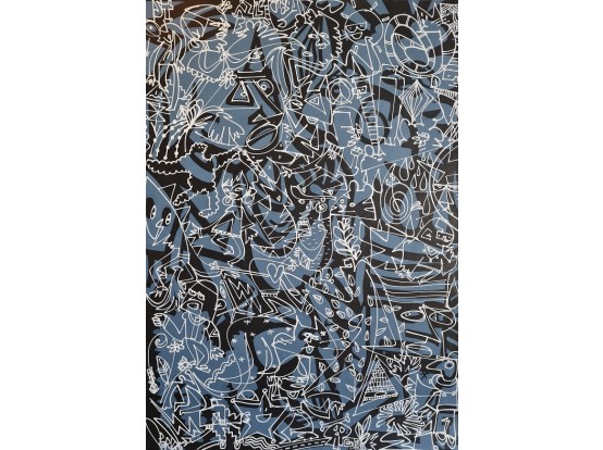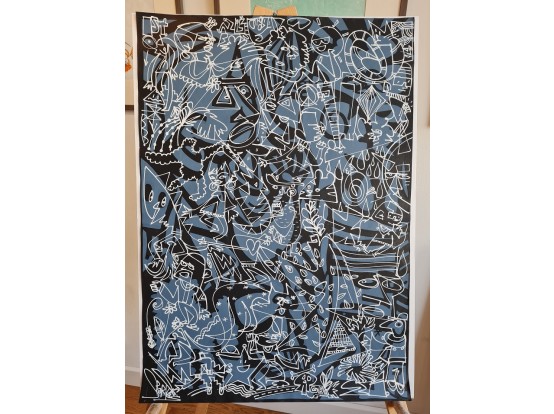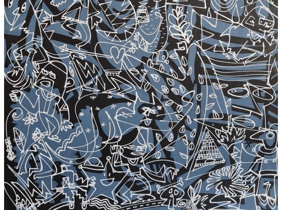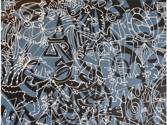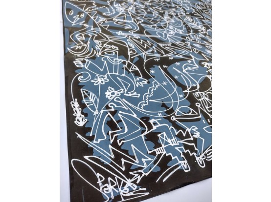 Large painting from 2021 by the English artist Leon Sparkes. An original hand-drawn illustration with quirky characters on an abstract and dotted background. This work was created using mixed media. pen, paint and spray paint on patterned paper.