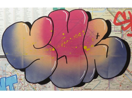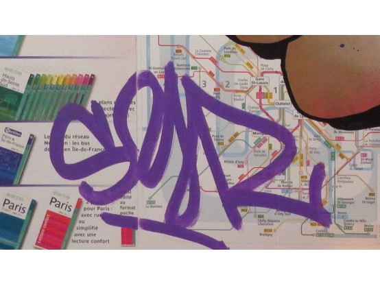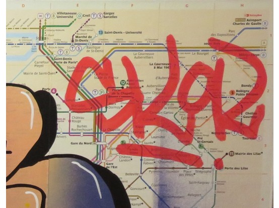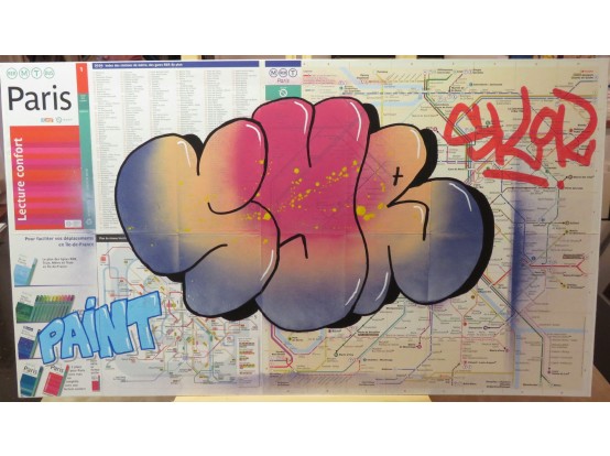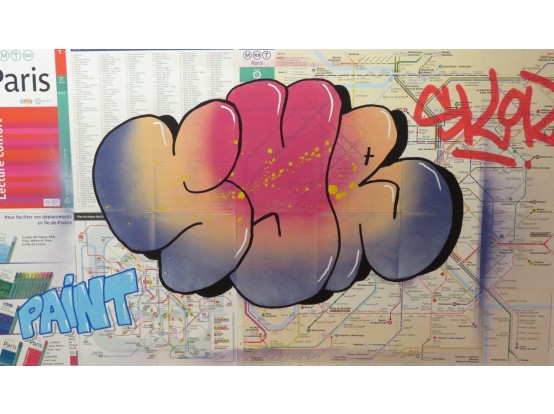 Spray paint on the map of the Metro in Paris. Very original street art by the French artist SYR. It is one of a series of unique works, all made in the same way.
