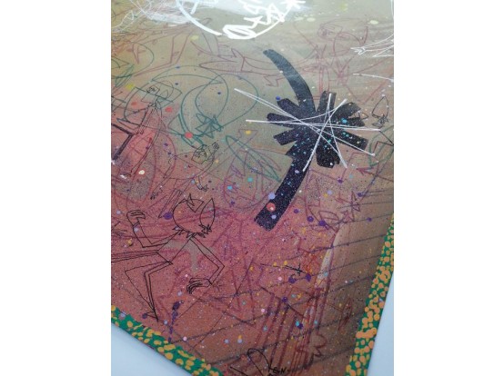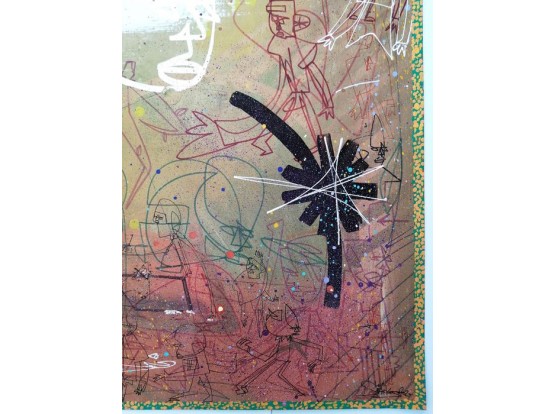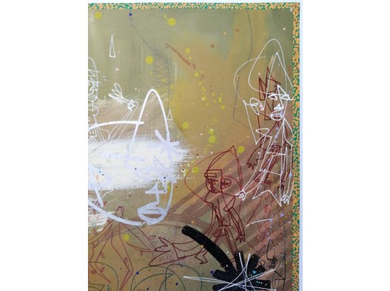 Large colourful artwork from 2020 by the English artist Leon Sparkes. An original hand-drawn illustration with quirky characters on an abstract and dotted background. This piece was created using mixed media. pen, paint and spray paint on patterned paper.