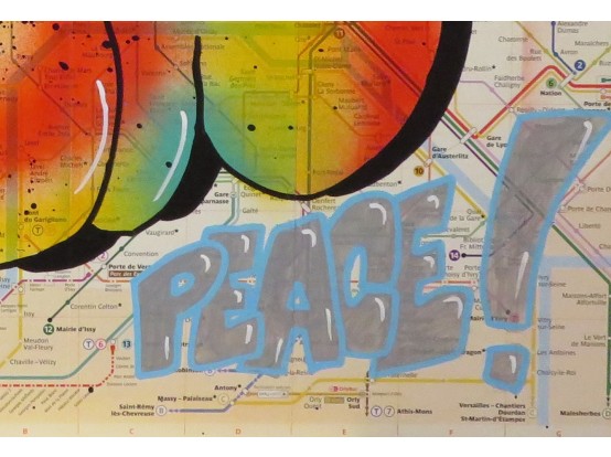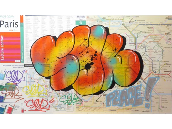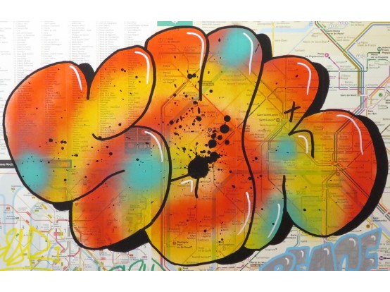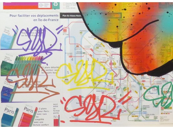 Spray paint on the map of the Metro in Paris. Very original street art by the French artist SYR. It is one of a series of unique works, all made in the same way.