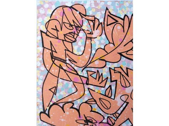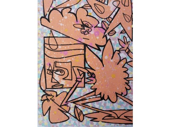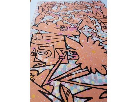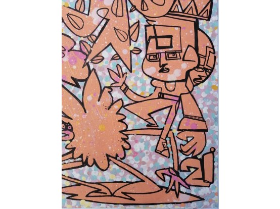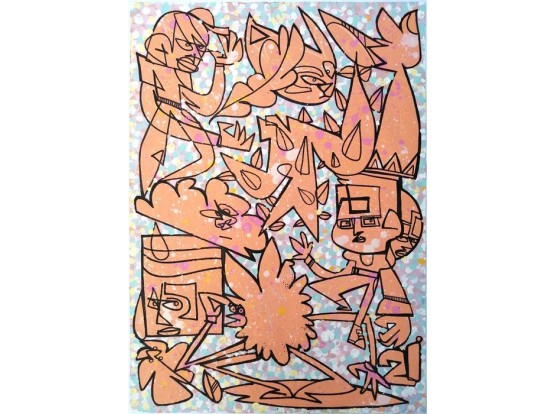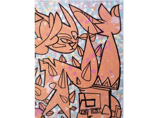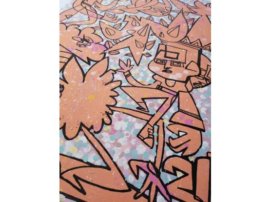 Large colourful artwork by the English artist Leon Sparkes. An original hand-drawn illustration with quirky characters on an abstract and dotted background. This piece was created using mixed media. pen, paint and spray paint on patterned paper.