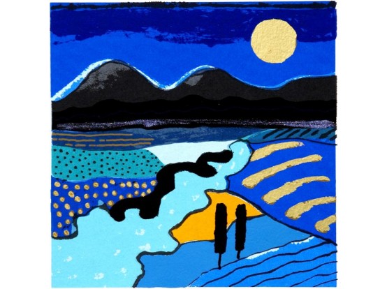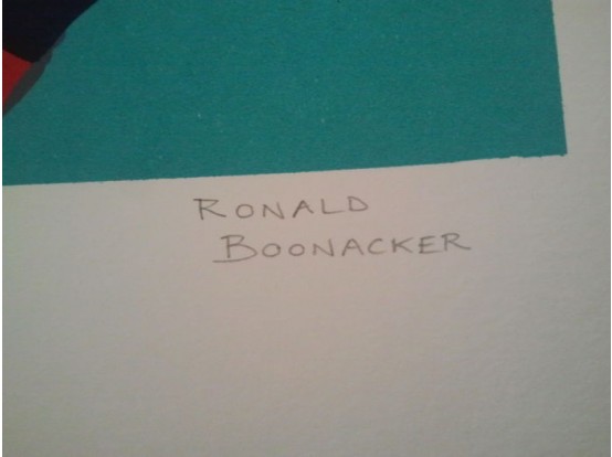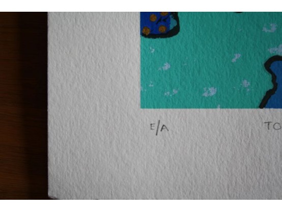 Gesigneerde zeefdruk van Ronald Boonacker. Afgedrukt op 250 grams zuurvrij papier. Blauw pigment en voorzien van 22 krt goud. EA-versie, afmetingen van het beeld zijn 20 x 20 cm.
