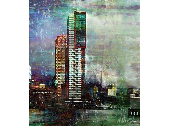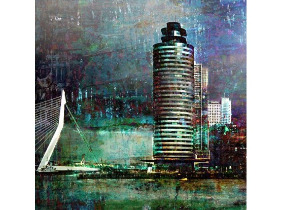 Indrukwekkende bewerkte foto van Wim Noordam. De foto is een afdruk in zeer hoge resolutie op 3 mm dibond. Kan dus in principe zo aan de muur met het bijgeleverde ophangsysteem. Voorstelling van de Rotterdamse wijk Kop van Zuid vanaf de Maas gezien.
