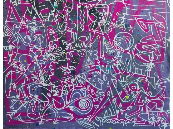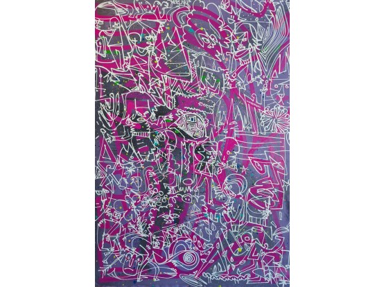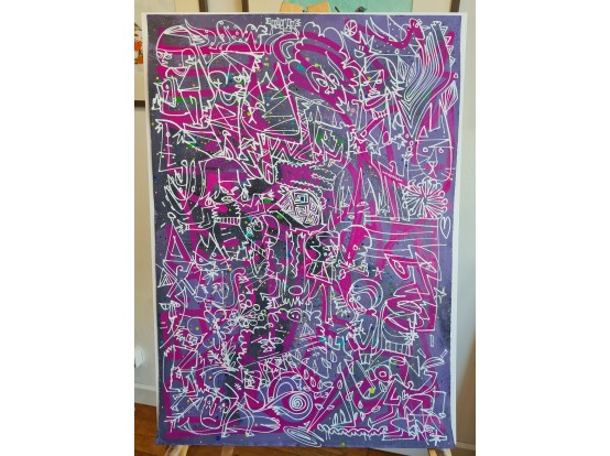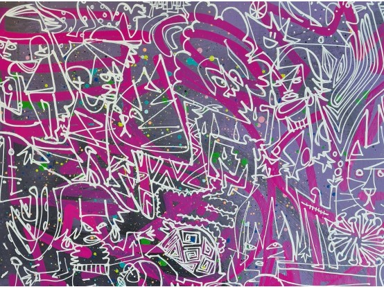 Groot kleurrijk werk uit 2021 van de Engelse kunstenaar Leon Sparkes. Een originele, met de hand getekende illustratie met eigenzinnige karakters op een abstracte en gestippelde achtergrond. Dit werk is gemaakt met behulp van gemengde media: pen, verf en spuitverf op patroonpapier.