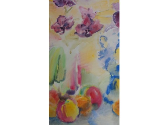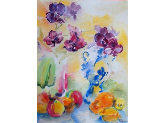 Kleurrijke aquarel van de van origine Russische kunstenares. Tegenwoordig woont en werkt zij in Amsterdam. Het werk is rechtsonder gesigneerd.