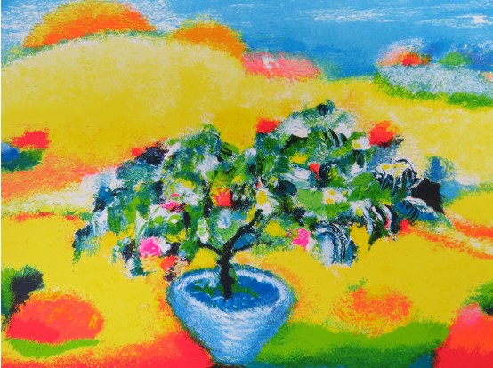 Zeer kleurrijke zeefdruk van de Saskia Bremer met een zeer eigen stijl. Het werk is in 2004 gemaakt in een serie van 150 oplagen. Dit is een EA-versie, die is gebruikt als proefdruk voor de uiteindelijke serie. Gesigneerd door de kunstenares. Afgedrukt door meesterdrukker Wout van der Vet.